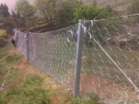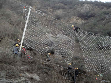 材質:鋼絲繩網、支撐繩和減壓環(huán)構造:由鋼絲繩網或環(huán)形網(需攔截小塊落石時附加一層鐵絲格柵)、固定系統(tǒng)(錨桿、攔錨繩、基座和支撐繩)、減壓環(huán)和鋼柱四個主要部分構成。